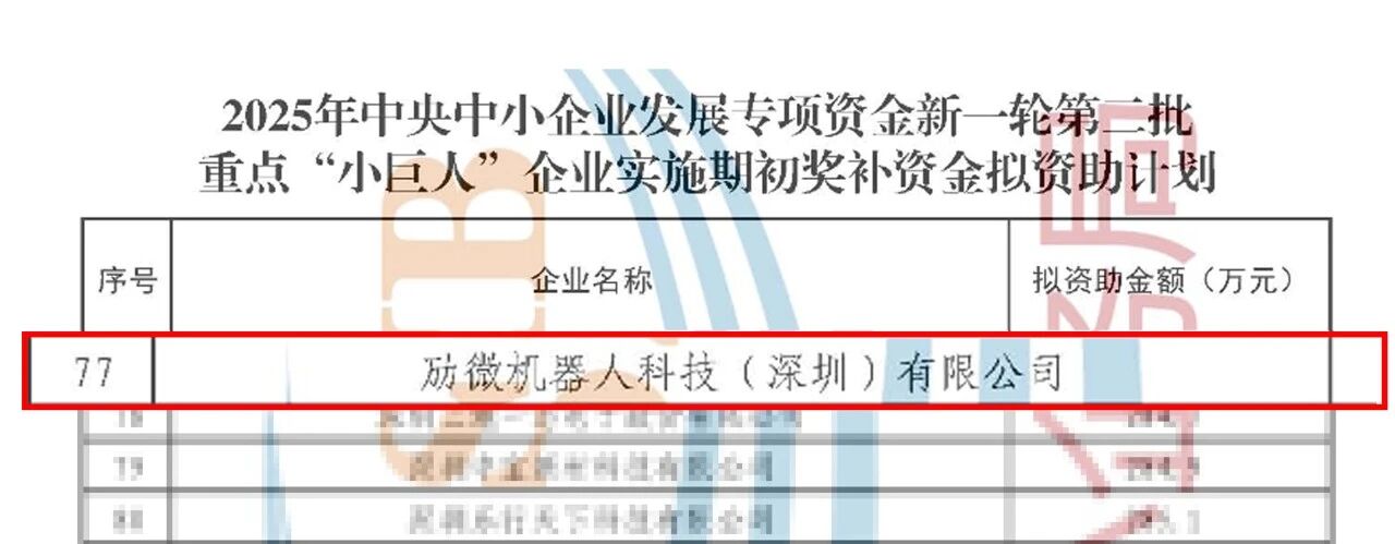2025年9月15日,国家财政部、工业和信息化部公布了新一批国家级重点“小巨人”企业认定名单。劢微机器人凭借在智能物流装备领域的持续深耕与卓越创新能力,成功入选。