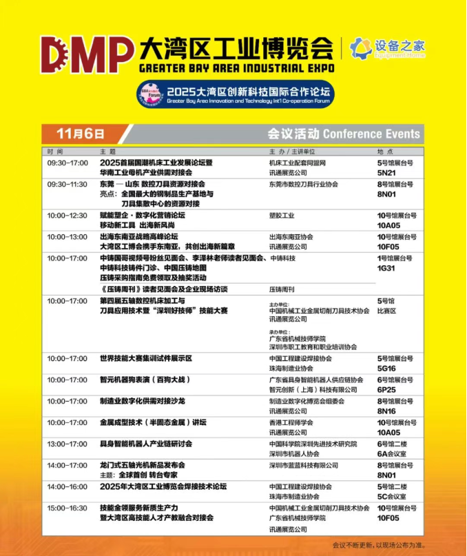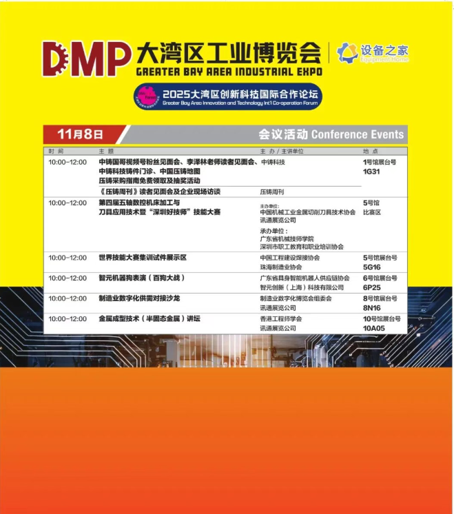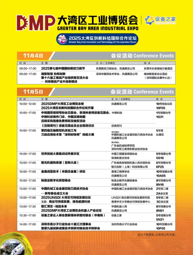 本届DMP工博会组委会将举办包含第七届中国国际数控刀具节、第四届五轴数控机床加工与工具应用技术暨“深圳好技师”技能大赛、DMP大湾区工博会机器人产业论坛、智能传感赋能新型工业化高质量发展论坛、龙门式五轴光机新品发布会、新能源汽车零部件与智能制造装备技术大会、机器人核心零部件技术攻坚与成本优化论坛、中铸科技铸件门诊等多达30+场高端会议论坛,一起探讨先进制造产业与新兴产业高增长高需求下的前沿、新生产技术,以及产业未来。