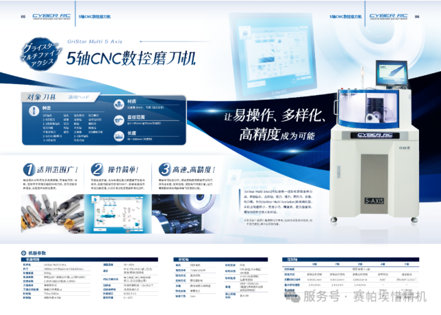 5轴控制,运动自由度高,可进行高级别刀具磨削。全自动磨削保证了精度的稳定。赛帕埃惜独创测针,结合高精度传感器系统提高了测量精度和磨削精度。
