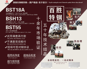 BST18A各项技术指标全面超越北美压铸协会NADCA #207标准中对应钢种(Dievar、8418、1.2367等)高级优质等级的所有技术指标。适用于各类长寿命、复杂、中大型铝、镁、铜合金压铸及低压铸造模具;铝、铜合金热挤压模具及热锻造模具。BSH13各项技术指标全面超越北美压铸协会NADCA #207标准中对应钢种(H13、8407、1.2344等)高级优质等级的所有技术指标。适用于各类铝、镁合金压铸模具;铝、铜合金热挤压模具及高强度耐热机械部件制造。
