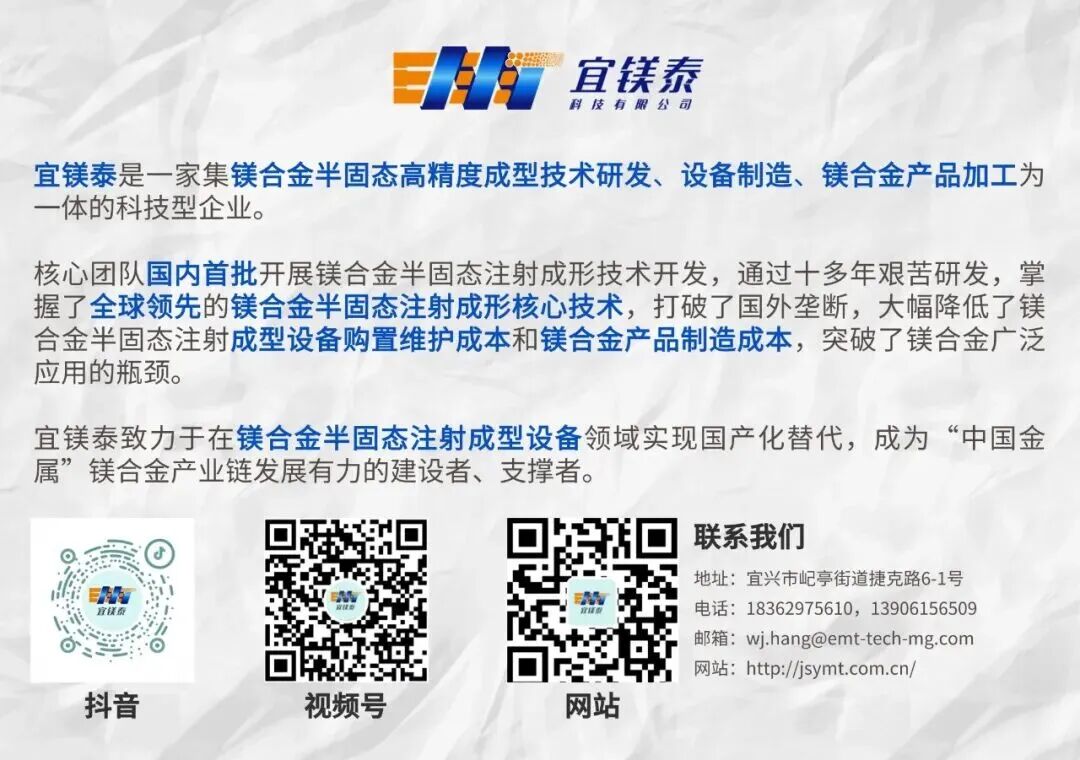 4 天时间里,展会吸引了超11万名专业观众到场,他们来自机械制造、汽车、半导体、医疗、新能源等多个核心领域行业头部企业参与外,行业全新技术应用领先企业看点也是层出不穷,比如在3C、新能源汽车轻量化、人型机器人等场景应用的: 镁合金半固态注射成型技术 其中,展会现场有三家代表企业:JSW、伯乐智能、宜镁泰;以下来自宜镁泰展后总结(部分)。 宜镁泰携半固态核心技术与全系列镁合金制品 首次亮相! 宜镁泰 24 2025大湾区工博会铸业展圆满收工,宜镁泰 一、打破垄断的 “镁合金解决方案” 宜镁泰展区半固态成型设备与多领域制品矩阵: 自主设备领跑行业:全系列镁合金半固态注射成型设备实现 100% 自主研发,彻底打破国外技术垄断。设备兼具 “无高温暴露安全操作、零有害气体排放、节能 60%” 三大核心优势,完美契合全球碳中和与轻量化制造趋势。 镁合金半固态注射成型设备,宜镁泰 多领域制品全覆盖:3C 精密构件、新能源汽车部件、医疗微创器械、户外轻量化装备等展品悉数亮相,直观呈现技术落地能力。其中 0.7mm 超薄壁件(最薄可做0.3mm)引发围观 —— 凭借全制程解决方案,产品致密力学性能较传统工艺提升 20%,27 项知识产权为品质背书。 各领域镁合金制品,宜镁泰 二、香港铸业总会会长亲临指导 香港铸造业总会梁诗雅会长一行专程莅临宜镁泰展区考察。 香港铸造业总会梁诗雅会长一行,宜镁泰 三、收获满满,共启新篇 四天展会,宜镁泰接待百余名镁合金及压铸行业专业采购商与合作伙伴,达成二十余项初步合作意向。 展会精彩瞬间,宜镁泰 如今展会落幕,合作新篇章正开启! 👉 即刻联系我们,定制您的镁合金解决方案! 2026 年 11 月 4-7 日 深圳国际会展中心(宝安) 数控机床、塑料机械、压铸、数字自动化、 高分子新材料、机加工服务等全新布局, 再绘工业新篇! 免责声明: 本公众号发布的内容(如文字表述、图片、视频等)主要源自本平台原创、授权转载或网络。我们虽努力确保内容准确完整,但无法绝对保证所有信息的真实性,请用户自行判断并承担风险。同时,本公众号尊重原创、保护版权,涉及版权问题请及时联系我们处理。