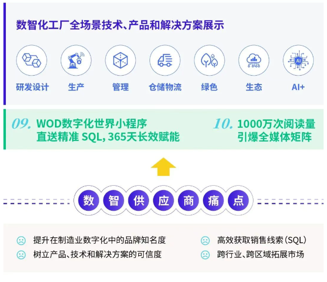 巨大的市场机遇下,数智供应商亟需一站式锁定制造业数字化全链条核心决策层,高效获取销售线索、引爆品牌知名度、构建专属生态圈。