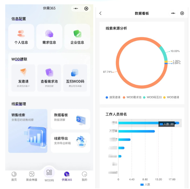 WOD 直击痛点:参展商通过小程序互扫 WOD 码,即可一键获取客户联系信息、需求详情及交流备注(精准 SQL),市场部实时汇总线索,无需人工筛选,省时高效,参展效果直观可见。