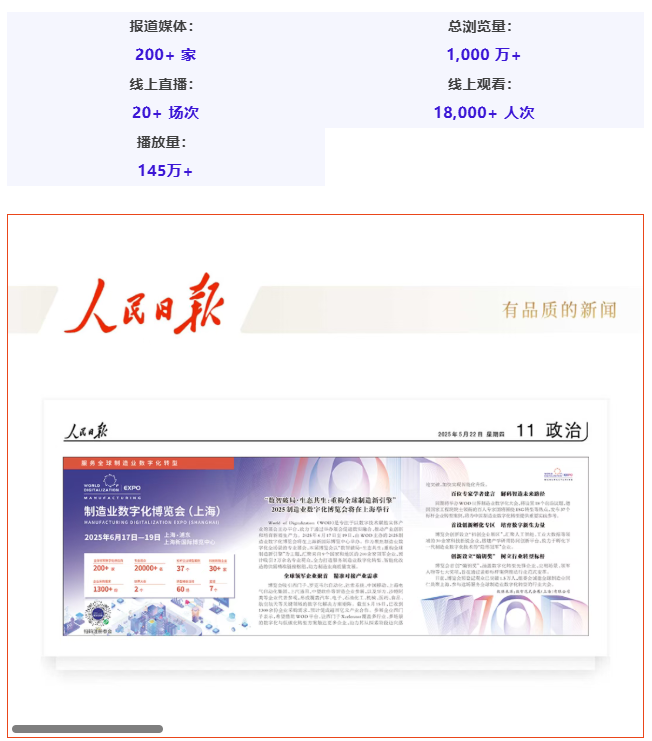 2025年展会构建了覆盖 “大众门户 + 行业垂直 + 移动端” 的三维媒体传播体系,超 200家媒体参与报道,总阅读量突破1000万次,实现从中央级媒体到细分领域平台的全域覆盖。对于参展商而言,这一媒体计划不仅通过中央电视台CCTV、人民日报、CGTN、新华社(新华财经)、央广网、中国日报网、中国新闻网、解放日报(上观新闻)、解放日报、澎湃新闻、中国青年报、中国网、环球网、文汇报、新民晚报、新闻晨报、SHINE、21世纪、潮新闻、交汇点新闻等国家级及省级平台,更借助第一财经、中国证券报、中国智能制造网、中华制造网、环球制造网、中国工业制造网等专业媒体精准触达制造业上下游决策人群,有效扩大技术解决方案与产品的市场声量。
